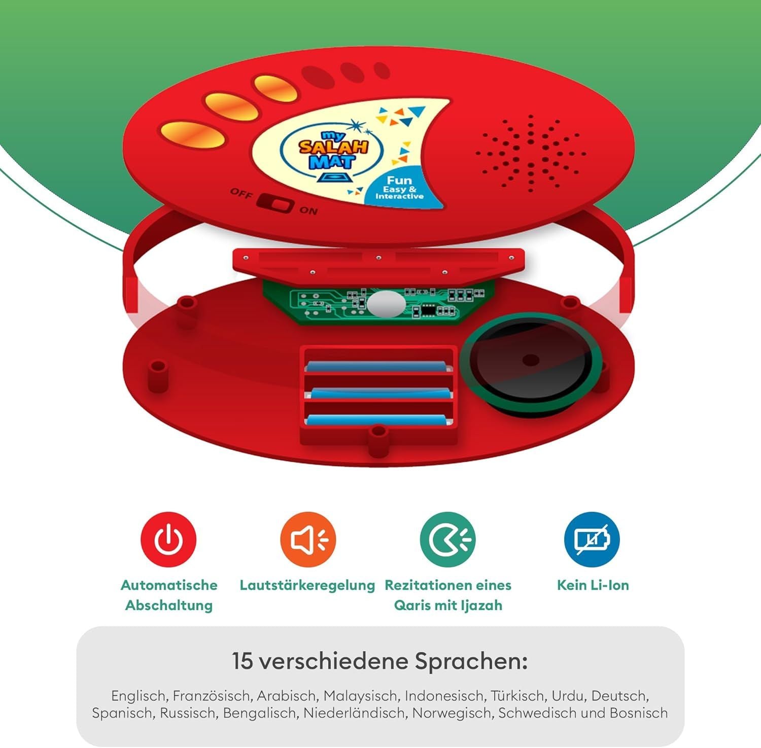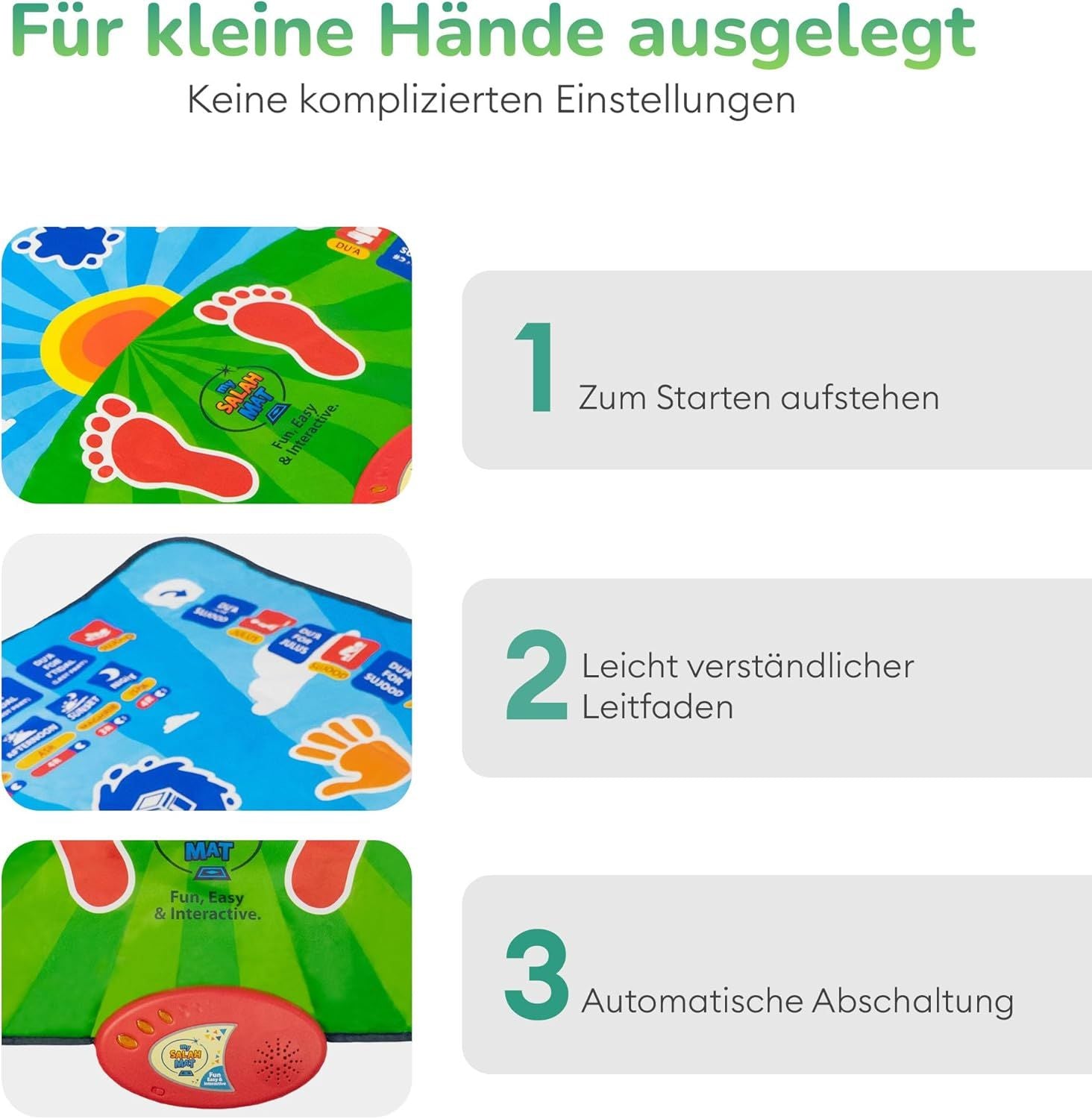 - The touch-sensitive prayer mats allow the user to recognize and respond to prayer positions. For example, when the user places their feet on the footrests on the prayer mat, the sensors in the My Prayer Mat recognize the pressure, and you will hear the first part of the Muslim prayer (Allahu Akbar), followed by Surah Al-Fatiha. Then when the knees, hands, and head touch the relevant spots on the mat, you will hear the sound of that part of the prayer.